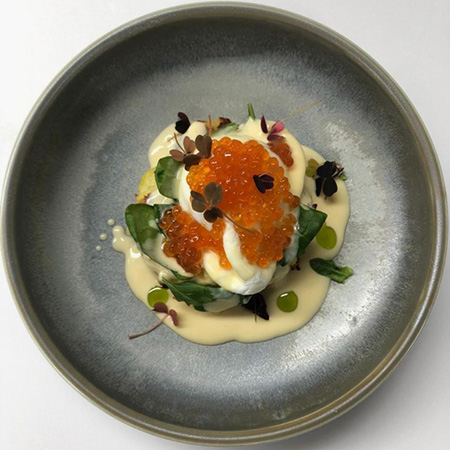 650 ₽ — драник с красной икрой, яйцом пашот и соусом морне