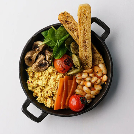 330 ₽ — английский завтрак с тофу, фасолью, шампиньонами и шпинатом