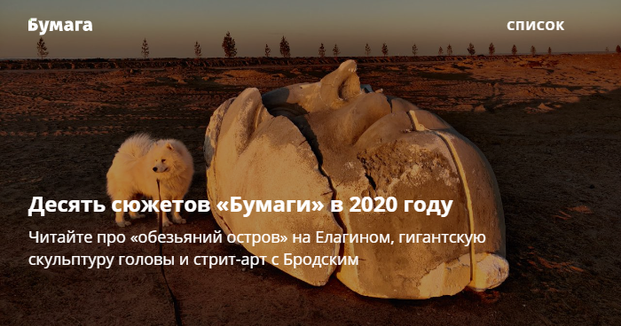 Как в начале 2000-х на Елагином острове ради научного эксперимента поселили макак и павианов, кто создал гигантскую скульптуру головы, которая почти год перемещалась по Васильевскому острову, и почему стрит-арт с Бродским на улице Пестеля стал мемом? «Бумага» вспоминает опубликованные в 2020 году сюжеты.