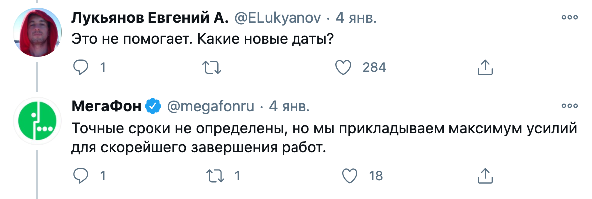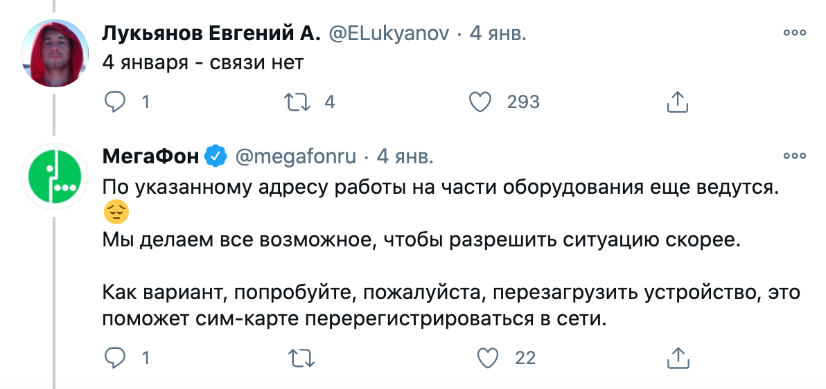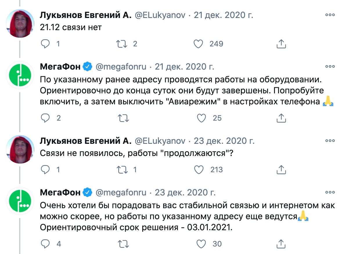 В ходе переписки оператор посоветовал Лукьянову перезагрузить телефон — по его словам, это не помогло. 4 января собеседник попросил Лукьянова написать «Мегафону» в личку, но, кажется, ремонт оборудования это не ускорило. Когда восстановят связь на Новопесчаной улице, пока неизвестно.