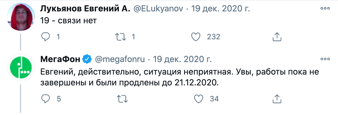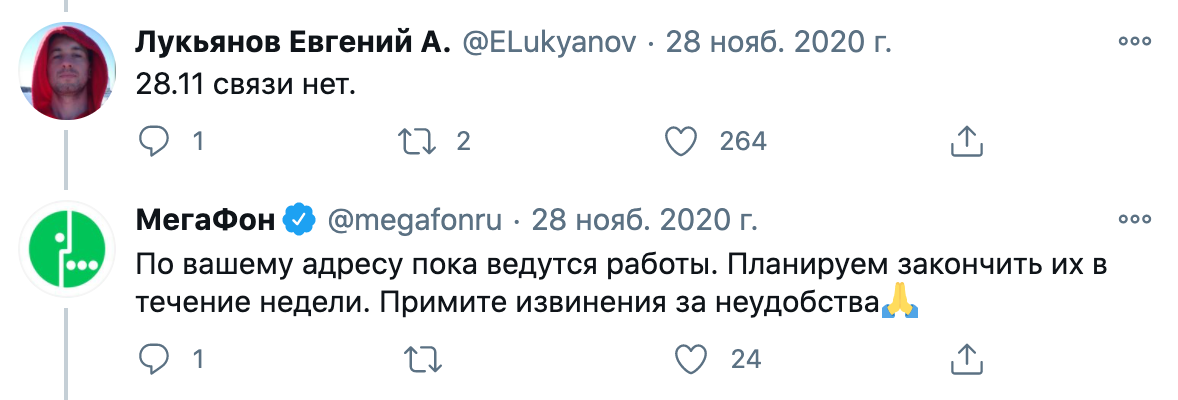 Житель Новопесчаной улицы в Москве Евгений Лукьянов 3 ноября написал в твиттере, что в его районе проблемы со связью — и тегнул официальный аккаунт компании «Мегафон». Ему сообщили, что по этому адресу ведутся «работы на оборудовании». За два месяца связь, судя по твитам Лукьянова, так и не появилась, зато оператор показал, как оправдаться, когда пропущен дедлайн (в этом случае — 10 раз).