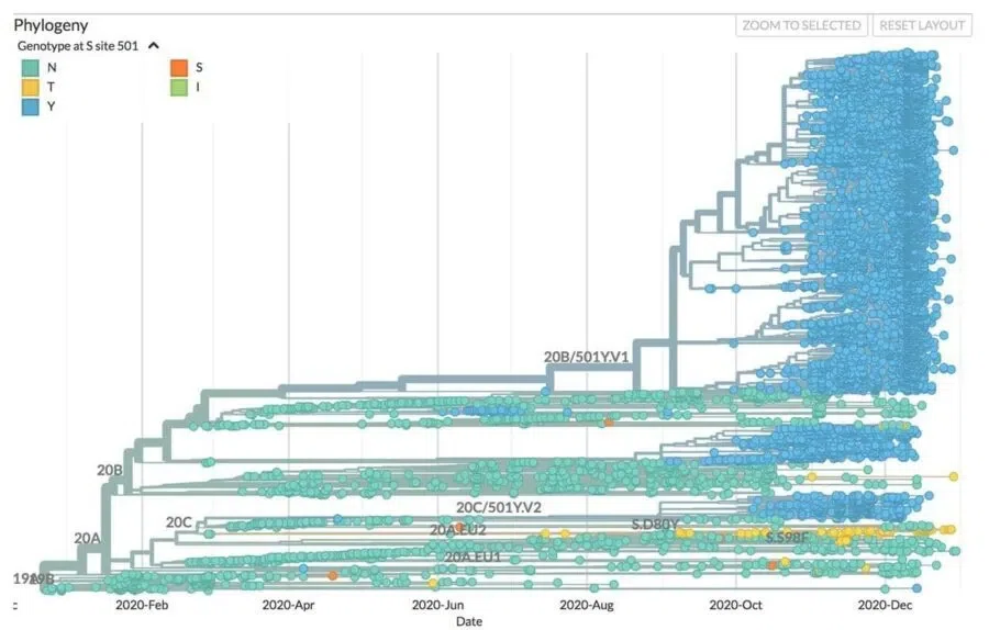 Какая у нас есть информация о распространении этого варианта? Качество данных зависит от страны (ресурсы для секвенирования и организация тестирования). Примером здесь, пожалуй, является Дания, которая секвенирует до 2000 геномов в неделю. 86 случаев VOC 202012/01 уже было зарегистрировано (11% всех новых случаев), и они развиваются в отдельной ветке, что означает, что имело место локальное распространение варианта. Ситуация же в Великобритании очень беспокоит, стране пришлось объявить новые строгие карантинные меры. Но дело здесь, скорее всего, не только в новом варианте вируса, а также в эпидемиологической ситуации по возвращению с каникул. Вообще относительно новых версий коронавируса важно не делать поспешных решений. Панику порождают высказанные вслух предположения. Так, некоторые британские специалисты высказались о том, что новый вариант опаснее для детей, но по факту, скорее всего, это связано с открытием школ.