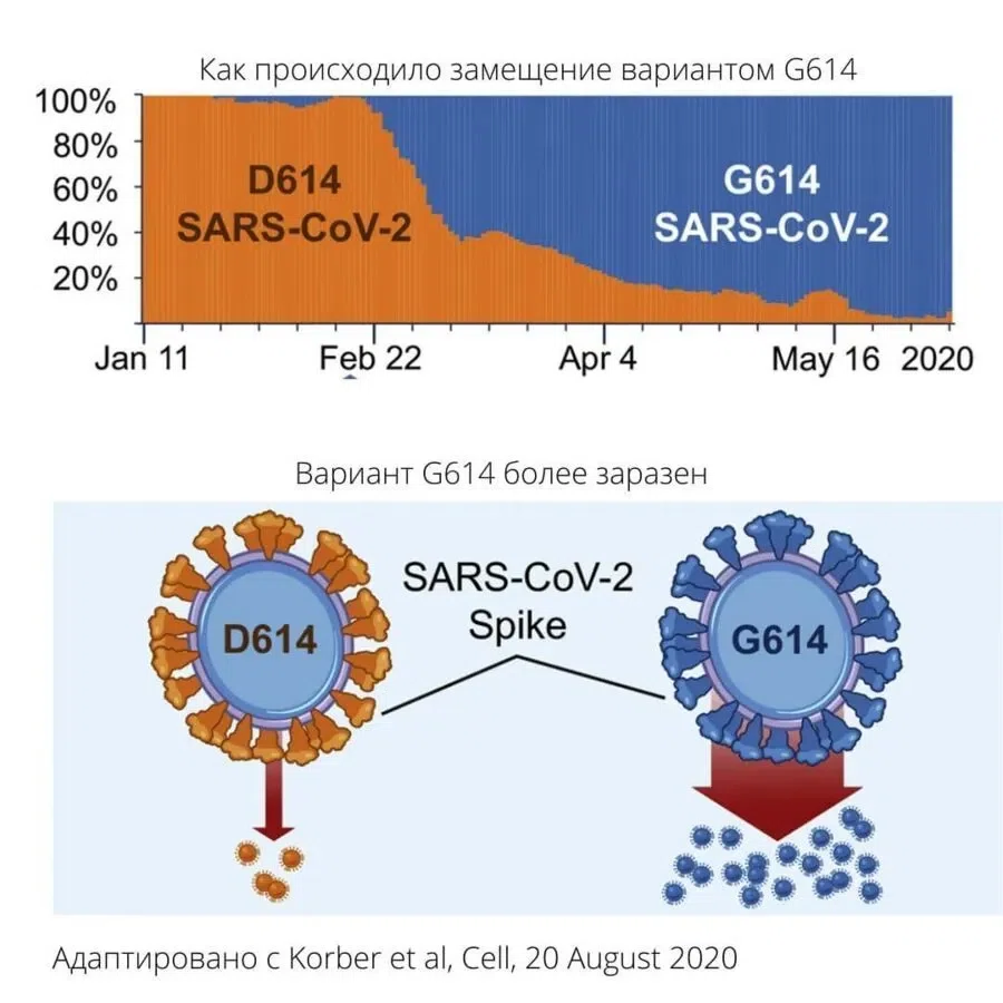 Итак, год назад появился новый коронавирус. Генетическая последовательность, которая используется в качестве начального образца генома коронавируса, была взята у пациента из Уханя в декабре 2019 года. Вирус тут же начал мутировать, а ученые сразу начали тщательно за этим следить. Уже в январе была замечена, пожалуй, главная мутация — D614G — замена аспартата на глицин на позиции 614 в белке-шипе. Мутация стала настолько важной и удобной для вируса, что уже к июню стала доминировать во всем мире. Эти две аминокислоты сильно различаются по своим свойствам и было ожидаемо, что такое изменение может значительно повлиять на поведение вируса. Как именно? Исходя из исследований на клетках, на лабораторных животных, а также согласно эпидемиологическим данным, мы можем сделать вывод о том, что этот вариант вируса заражает эффективнее, а также лучше размножается (Hou et al Science, 18 Dec 2020) в верхних дыхательных путях. Но также было предварительно показано, что эта мутация не влияет на тяжесть заболевания, на чувствительность к нейтрализующим антителам и на эффективность вакцин.