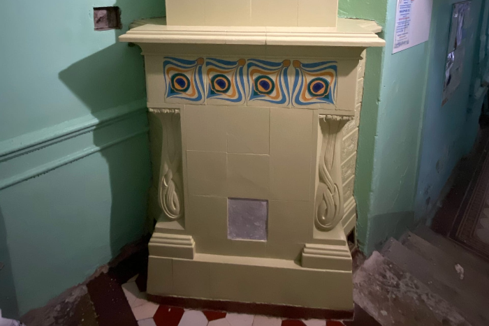 Краеведы из объединения «Гэнгъ» отмыли печь в парадной доходного дома Эрлиха на улице Ленина. Они воссоздали оригинальный цвет печи, сняв с нее 11 слоев краски, восстановили и расписали изразцы.