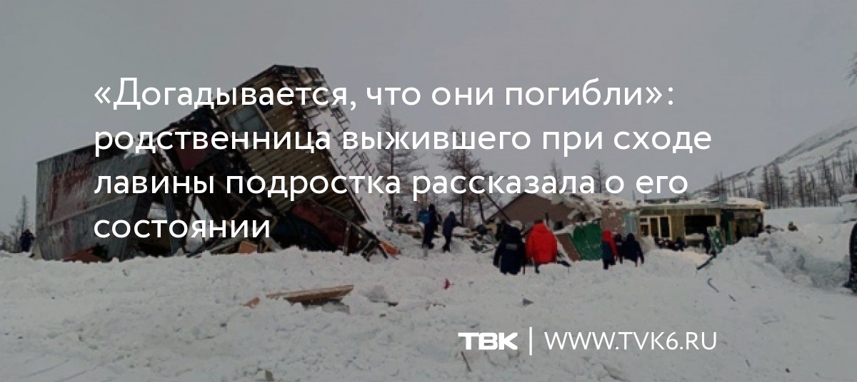 «В тот момент он не спал, готовился ко сну, услышал треск, вспышки, и потом ударная волна от лавины разнесла домик. Говорят, его спасло, что рядом с ним был то ли спальник, то ли одеяло. Что-то теплое. И была возможность дышать. Он провел в снегу почти три часа, получил сильное переохлаждение, но его состояние удалось восстановить», – говорит Раиса Бердникова.Помимо этого женщина пока не рассказала о смерти его семьи, но мальчик догадывается об этом. Также родственники объявили о сборе средств на реабилитацию молодого человека.