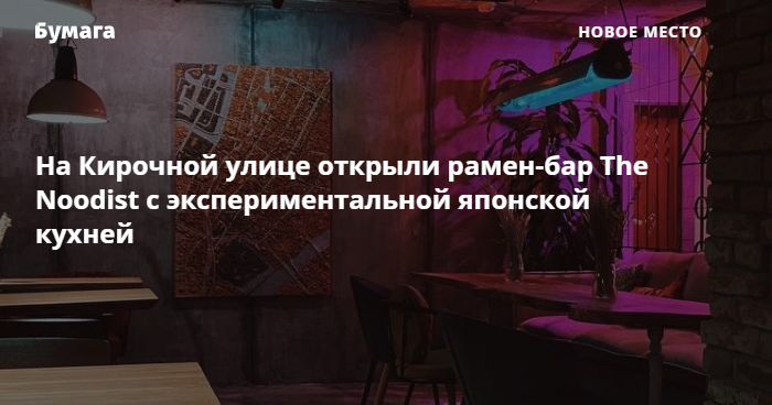 Через несколько месяцев создатели The Noodist нашли подходящее помещение на Кирочной. Пространство на 52 посадочных места оформила дизайнер Таня Коршунова. Главные акценты — открытая кухня и неоновый свет.
