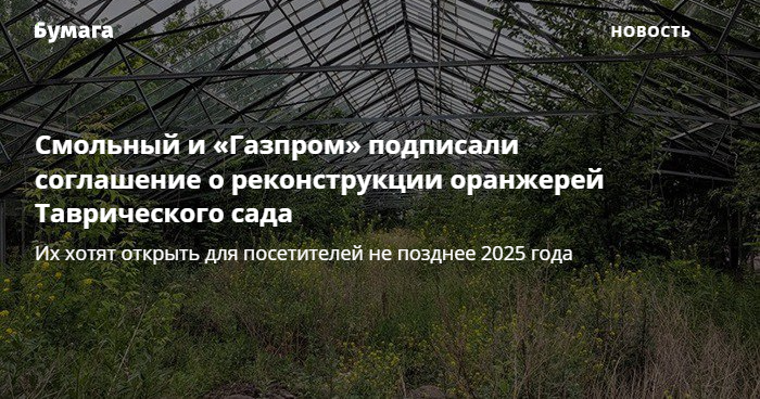 Фонд поддержки социальных инициатив «Газпрома» стал единственным участником конкурса на реконструкцию оранжерей Таврического сада. В 2019 году сообщалось, что в проекте были заинтересованы и другие компании. «Бумага» подробно рассказывала о проекте, который тогда представил холдинг Ginza Project.