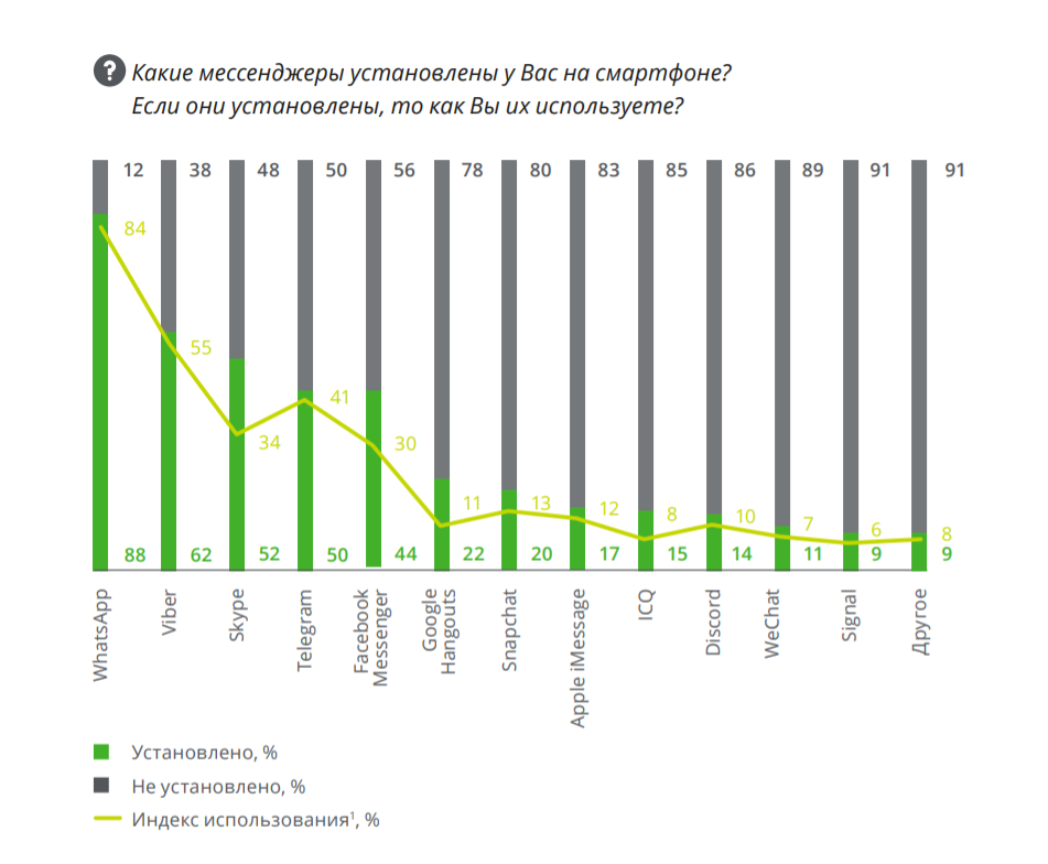 • WhatsApp — самый популярный мессенджер среди россиян с приличным отрывом от конкурентов. По данным октябрьского исследования Deloitte, Telegram установлен на смартфонах у 88% российских интернет-пользователей. На втором месте Viber (62%), на третьем — Skype (52%). Telegram (50%) — четвертый, а его главный мировой конкурент по позиционированию «защищенного мессенджера», Signal (9%) даже не входит в десятку.