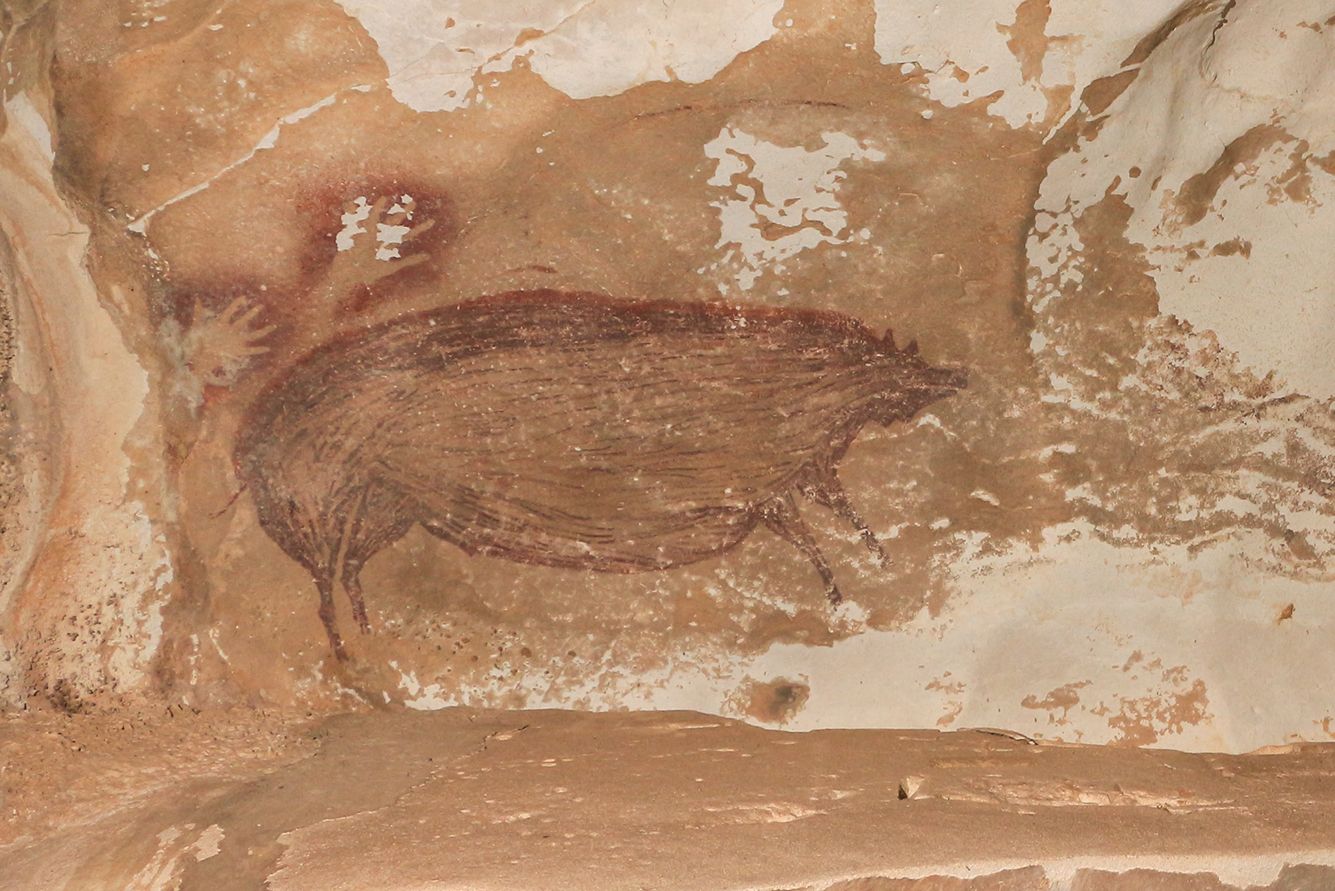 На индонезийском острове Сулавеси нашли наскальное изображение свиньи, сделанное 45 тысяч лет назад. Это древнейший рисунок животного. Предыдущим древнейшим изображением животного считался наскальный рисунок, показывающий сцену охоты, также найденный на Сулавеси. То изображение было сделано 43,9 тысячи лет назад. Интересно, чьи там руки, кстати!
