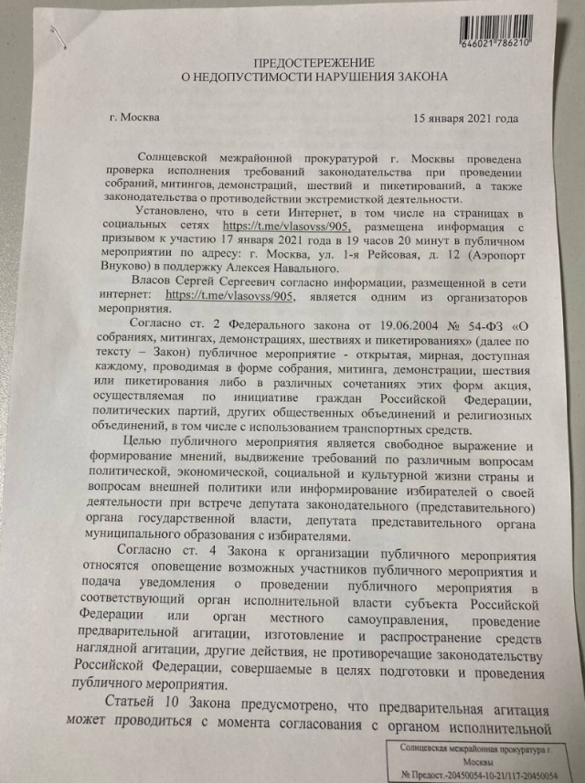 _«В сети Интернет, в том числе в социальных сетях, размещена информация с призывом к участию 17 января 2021 года в 19 часов 20 минут в публичном мероприятии по адресу: г. Москва, улица 1-я Рейсовая, дом 12 (Аэропорт Внуково) в поддержку Алексея Навального. Власов Сергей Сергеевич, согласно информации, размещенной в сети Интернет, является одним из организаторов мероприятия».& _