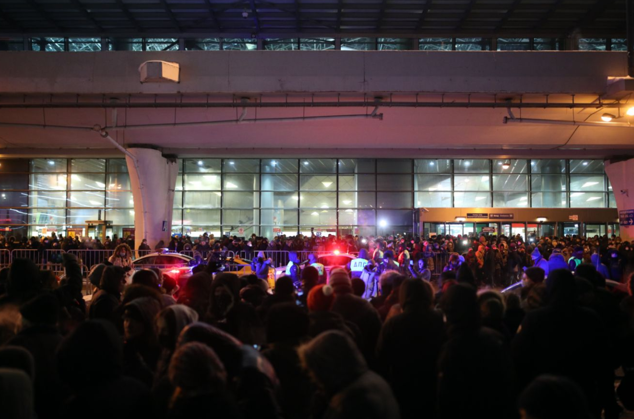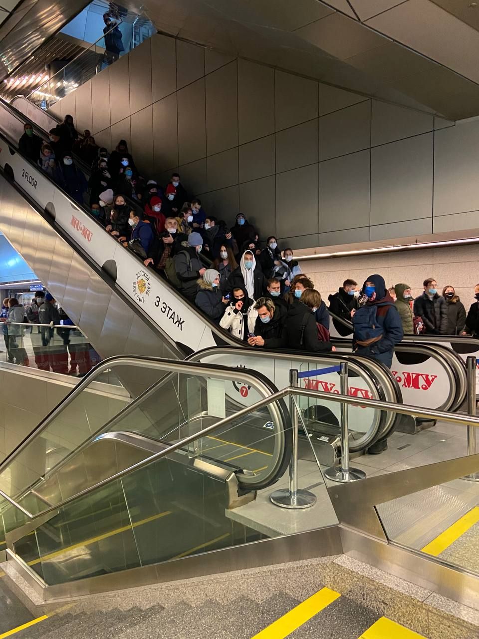 At Vnukovo Airport, riot police officers are shouting through megaphones: “Please leave the airport. Only ticketed passengers will be admitted.” Some people in the crowd are yelling back “Fascists!”