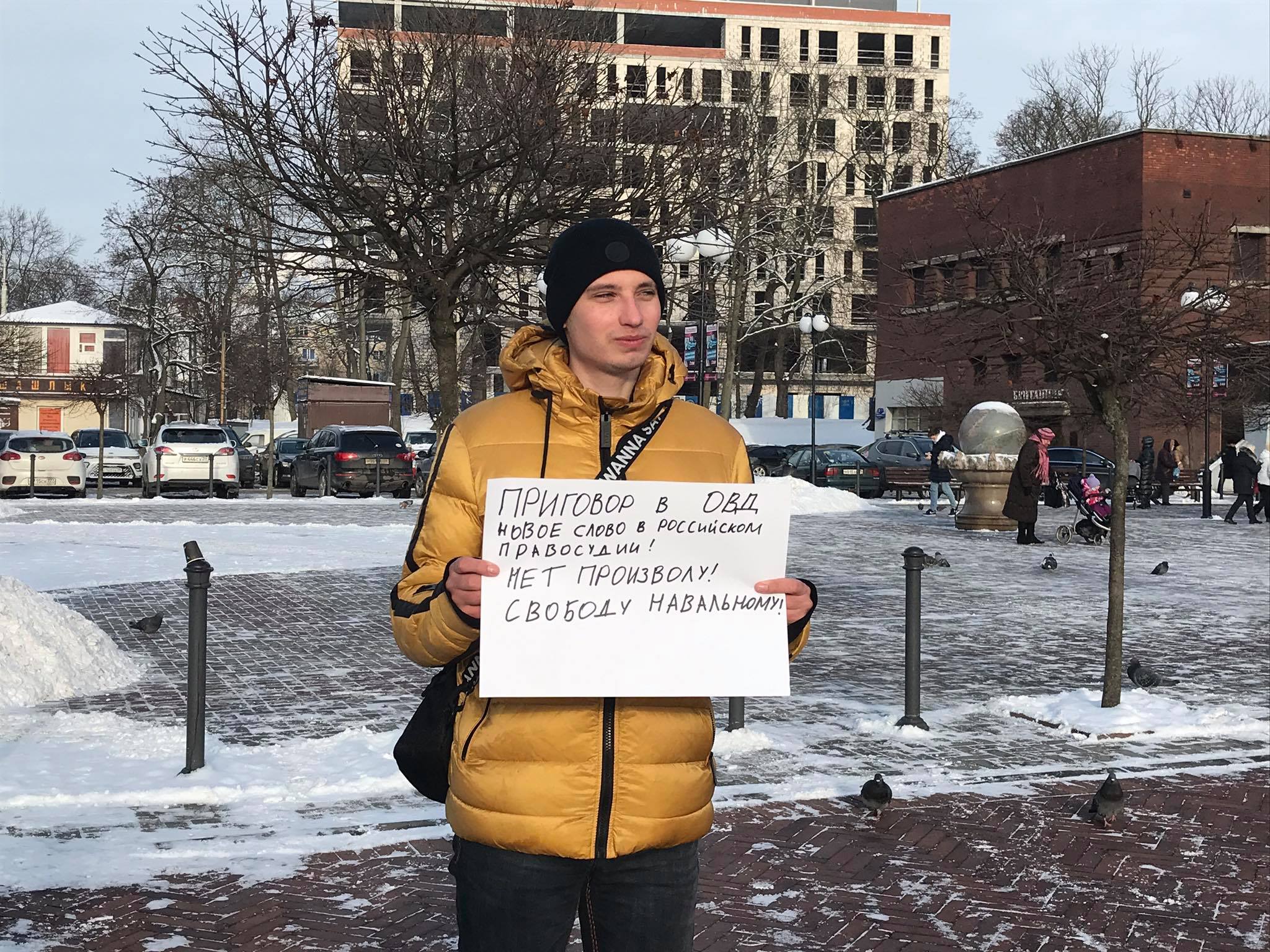 Калининградский блогер Николай Горелов, которого обвиняли в реабилитации нацизма за созданный им сатирический рассказ, пришел с плакатом "Отпустите Навального".