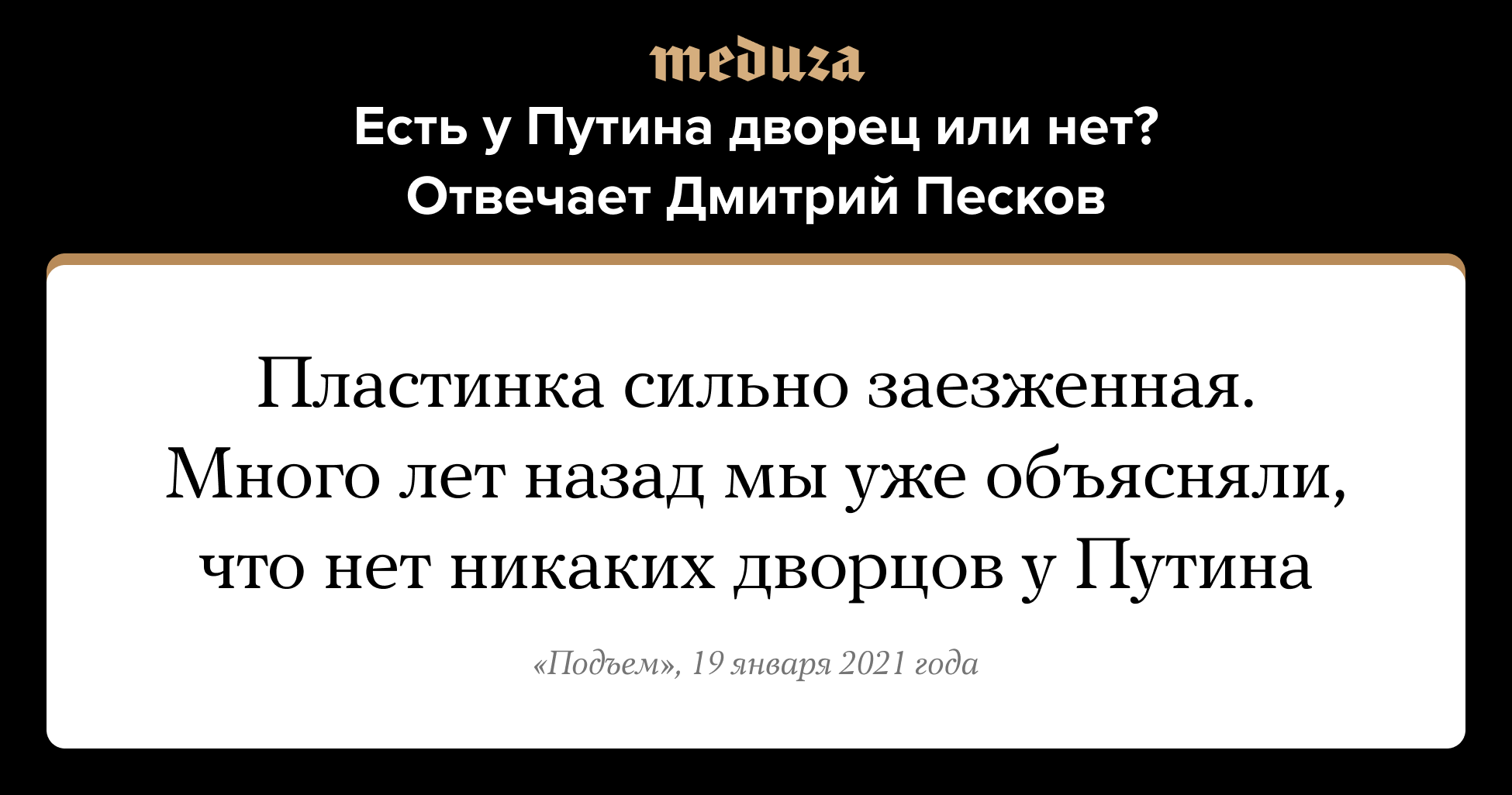 Сегодня Дмитрий Песков провел первый в новом году брифинг с журналистами. Его спросили и о страхе Владимира Путина перед Навальным («полная и абсолютная ерунда»), задержаниях в аэропортах (задержанные нарушали общественный порядок), призывах Навального к митингам (это «тревожные» призывы, но протестов в Кремле «не опасаются») — и о многом другом.
