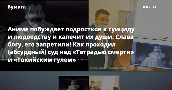 Посмотрев по одному эпизоду «Инуяшики», «Тетради смерти» и других аниме, прочитав описание сериалов на «Википедии» и выслушав экспертов, к компетенции которых нет никаких вопросов, судья понимает, что узнал достаточно.
