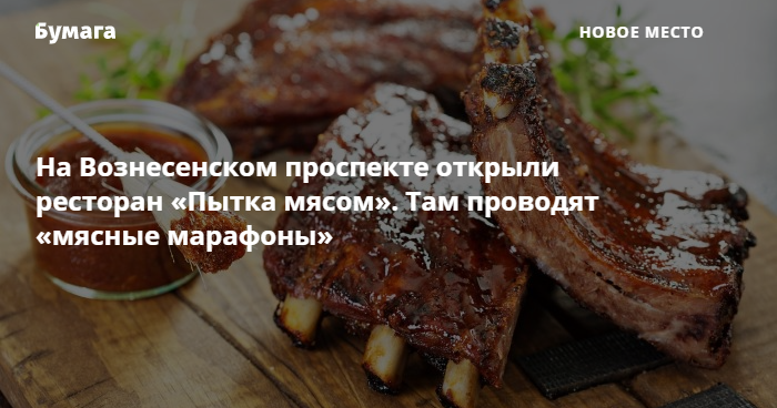 На Вознесенском проспекте, 4 начал работу ресторан «Пытка мясом», рассказали «Бумаге» представители заведения. Проект вырос из одноименной серии гастрономических мероприятий, в ходе которых гостям подавали различные мясные блюда, закуски, гарниры и соусы.
