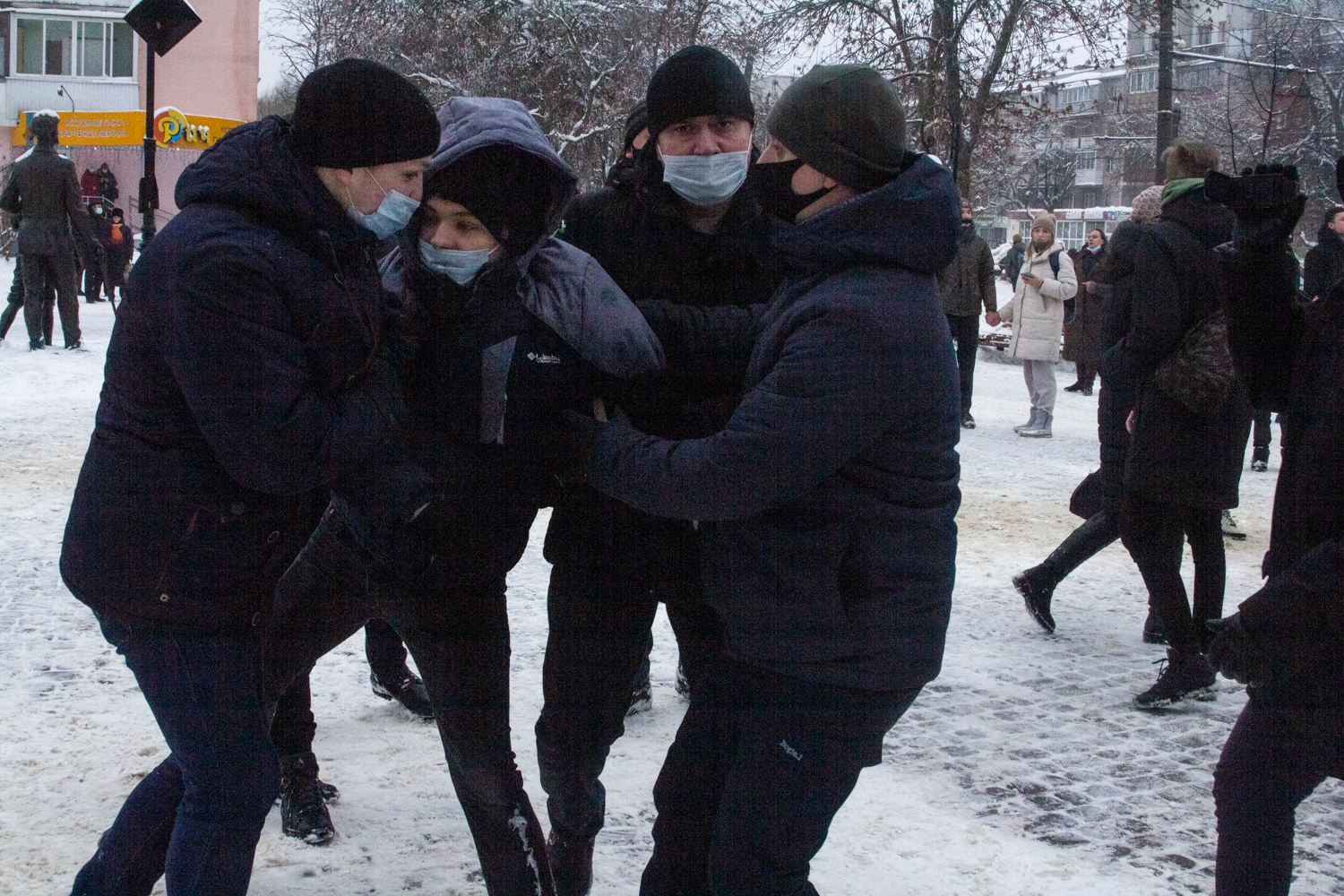 На площади Победы начали задерживать участников акции. Сотрудники полиции, многие из которых в штатском, отводят протестующих в автозаки.