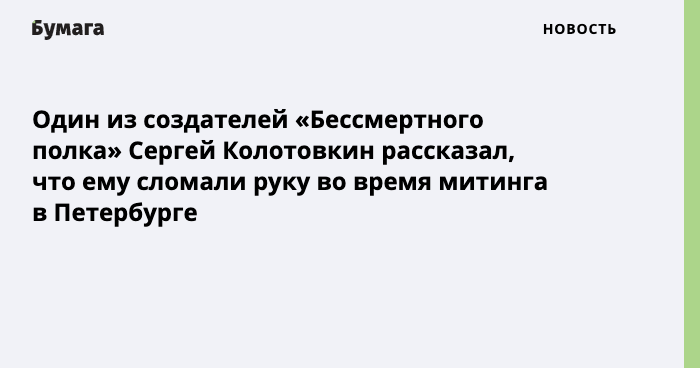 Один из создателей «Бессмертного полка» Сергей Колотовкин сообщил, что ему сломали руку при задержании на акции в поддержку Навального 23 января в Петербурге. Он опубликовал об этом пост на странице в фейсбуке.