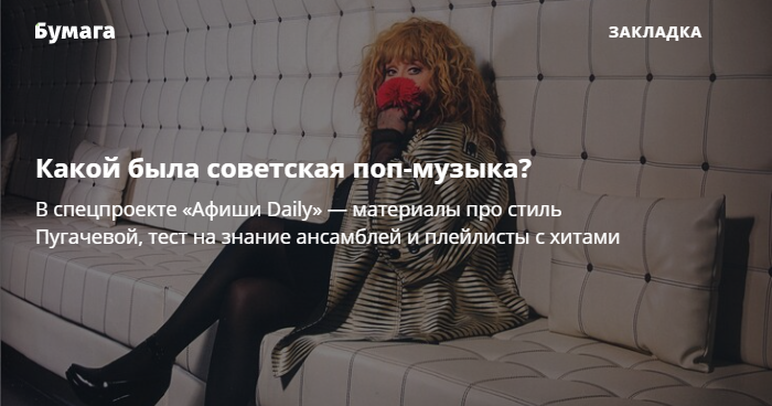 «Афиша Daily» выпустила спецпроект про советскую поп-музыку — с материалами про стиль Аллы Пугачевой и Валерия Леонтьева, плейлистами и тестом на знание вокально-инструментальных ансамблей.