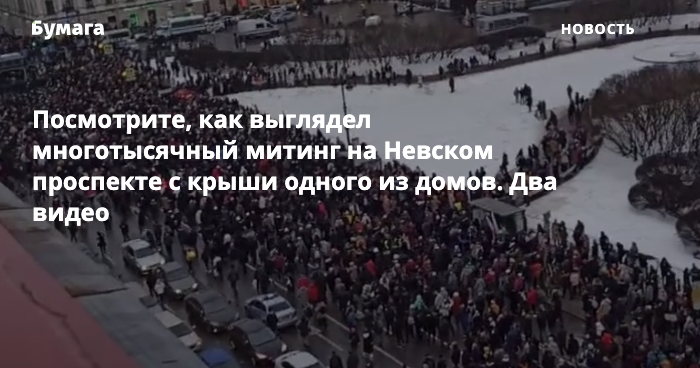 В Петербурге 23 января прошла несогласованная акция в поддержку Алексея Навального и против действующей власти. По разным оценкам, на митинг вышло от 15 до 30 тысяч человек. «Бумага» публикует две видеозаписи, сделанные с крыши дома по адресу: Невский проспект, 22.