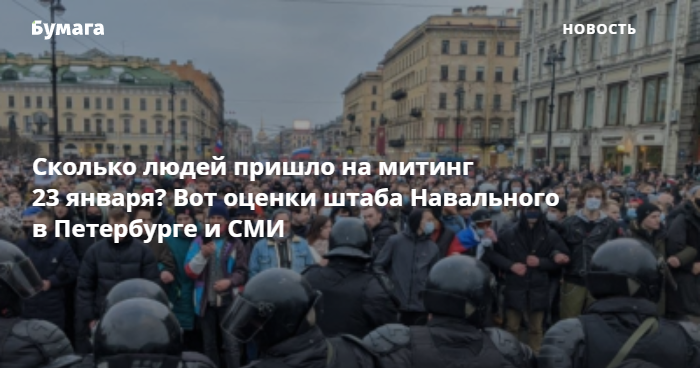 В Петербурге на несогласованной акции в поддержку Алексея Навального и против действующей власти, прошедшей 23 января 2021 года, по разным подсчетам, участие приняли от 5 до 30 тысяч человек.