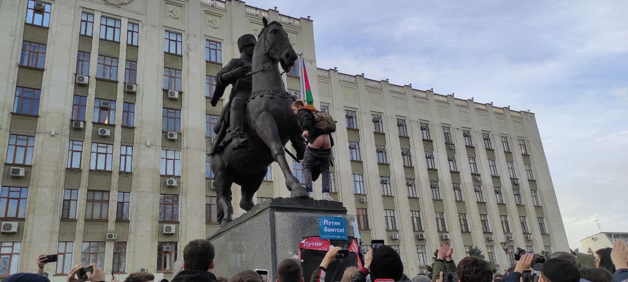 Егоров залез на памятник Кубанскому казачеству в виде казака на коне, после чего «надел трусы на копыто коня, затем снял с себя штаны, обнажив ягодицы, повернулся сначала в сторону административного здания, хлопнув себя по ним, чем грубо нарушил общественный порядок», пишет Чиков.