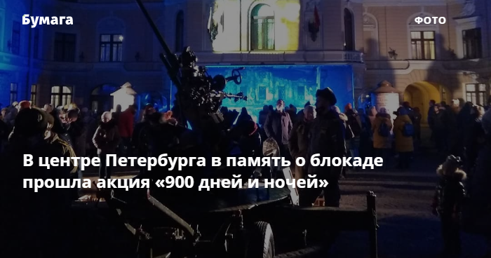В центре Петербурга в память о блокаде прошла акция «900 дней и ночей». Во дворе Капеллы показывали военную технику, оружие, а также вещи солдат, которые обнаружили во время поисковых экспедиций. На фасадах также демонстрировали кадры военной кинохроники.
