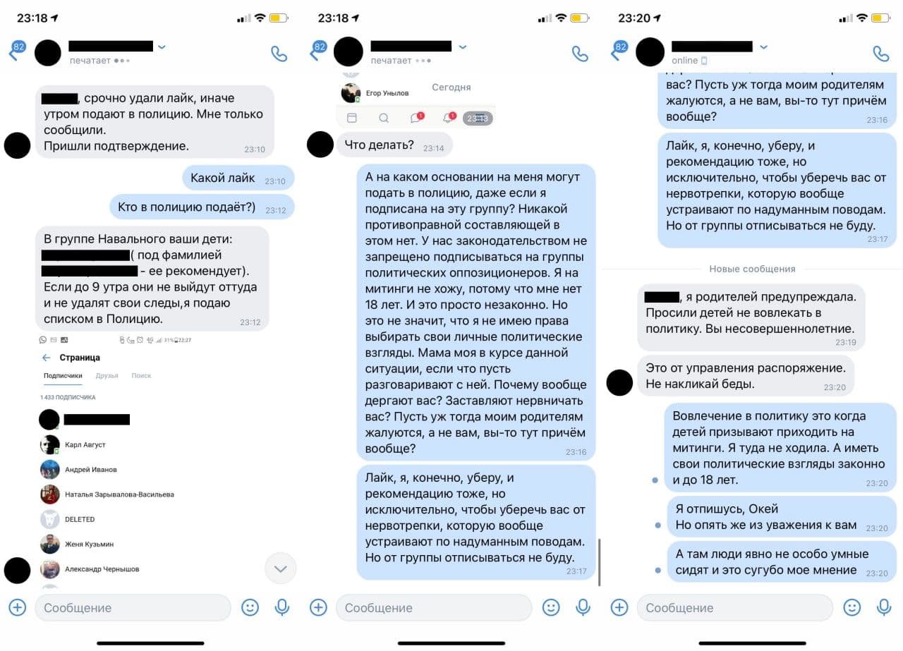 Маша ответила классной, что лайк и участие в группе никак не тянут на противоправную деятельность, а закон не запрещает подписываться на группы оппозиционеров. И добавила, что на митинги она не ходит, потому что ей нет 18. "Но это не значит, что я не имею права выбирать свои личные политические взгляды. Мама моя в курсе данной ситуации, если что, пусть разговаривают с ней. Почему вообще дергают вас?" – возмутилась она, но пообещала убрать лайк "исключительно, чтобы уберечь классного руководителя от нервотрепки, которую устраивают по надуманным поводам". "Родителей предупреждала. Просили детей не вовлекать в политику, вы несовершеннолетние. Это от управления распоряжение. Не накликай беды", – отреагировала учитель.
