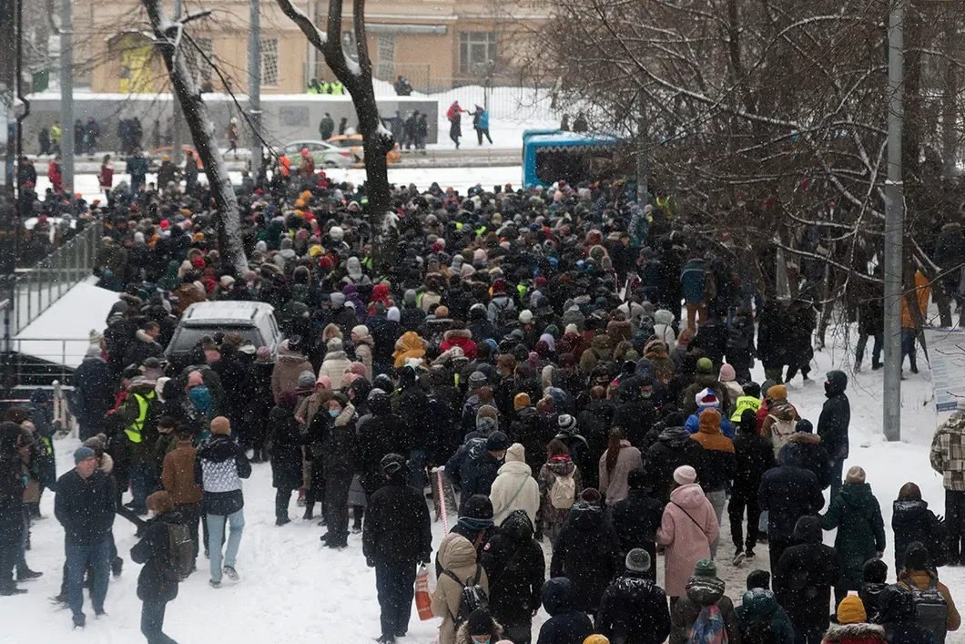 Вскоре люди направились по Русаковской улице в сторону СИЗО «Матросская тишина», в котором сидит Алексей Навальный. По Русаковской курсировали переполненные трамваи и автобусы — пытаясь миновать кордоны, выставленные на обочинах, протестующие садились в общественный транспорт. До СИЗО добрались не все. На Русаковской «космонавты» без разбора выхватывали людей и засовывали их в автозаки. В толпе говорили про электрошокеры. У «Матросской тишины» продолжились жесткие задержания. Людей волокли по снегу, выворачивали им руки, применяли спецсредства под названием «дубинка». Одного из протестующих увезли на «скорой».