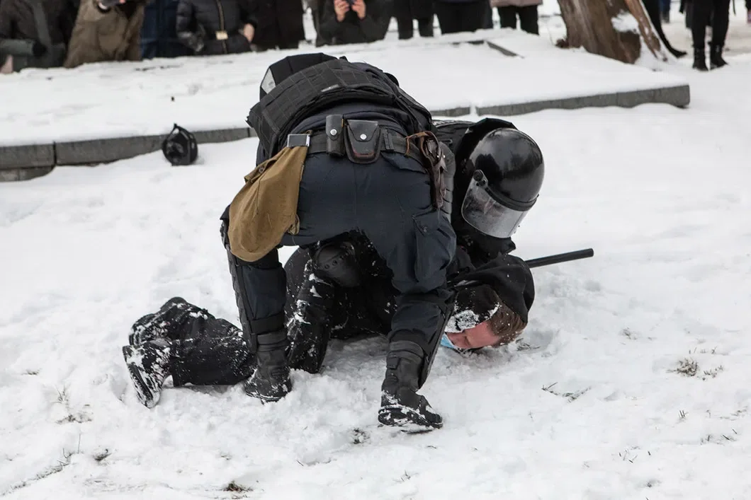 Здесь же рядом, на Бородинской, случился первый резонансный инцидент протестного дня: пятеро омоновцев набросились на мужчину, который пытался сопротивляться задержанию. Его прижимали к стенке, применяли дубинки, очевидцы заметили в их руках электрошокеры. «Помогите! Почему вы стоите?» — кричал он толпе. В автозак, где вместе с ним оказался и журналист «Новой», мужчину заносили уже в бессознательном состоянии. Когда он пришел в себя, автобус вез задержанных в отдел полиции в Сестрорецке — ближайшие участки стремительно наполнялись гражданами.