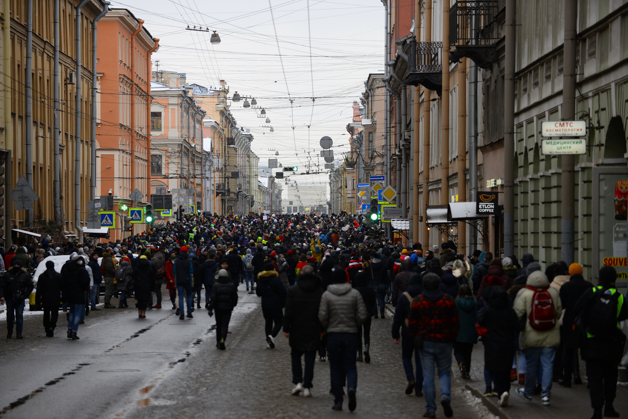 Организованной колонной люди двигались по Загородному через Московский проспект — к Сенной. От Обуховского моста участники акции шли уже по проезжей части, скандируя «Россия», «Отпускай!» и «Свободу Алексею Навальному!».