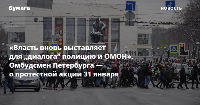Уполномоченный по правам человека в Петербурге Александр Шишлов назвал «фактически войсковой операцией» действия правоохранительных органов в отношении участников протестного митинга 31 января. Об этом сообщает пресс-служба омбудсмена.