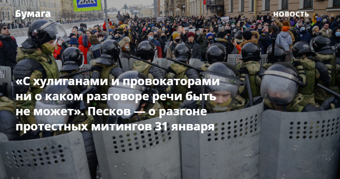 Пресс-секретарь президента Дмитрий Песков объяснил задержание более пяти тысяч человек на протестных акциях 31 января тем, что митинги не были согласованы, а участвовали в них «хулиганы и провокаторы». Запись его выступления на брифинге приводит радио «Маяк».