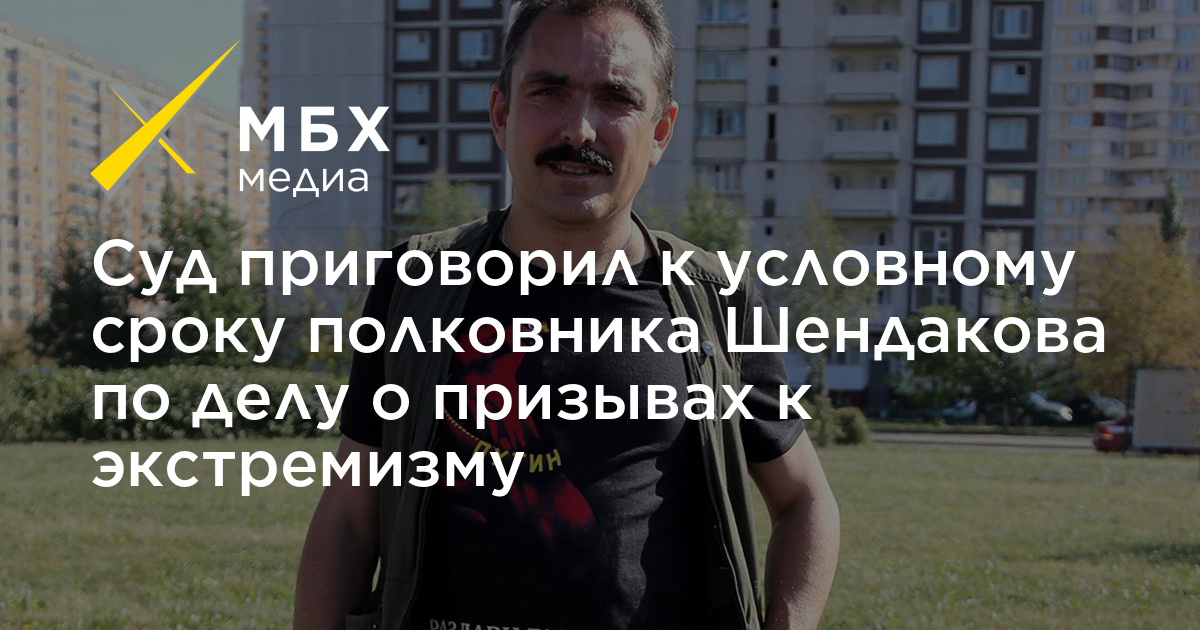 Красногорский городской суд признал активиста и полковника ВС в запасе Михаила Шендакова виновным по ч. 1 ст. 282 УК (возбуждение ненависти к социальной группе) и ч. 2 ст. 280 УК (публичные призывы к экстремизму в интернете), и назначил наказание в размере 2 лет 6 месяцев лишения свободы условно. Об этом «МБХ медиа» рассказал координатор «Левого фронта» Сергей Удальцов.