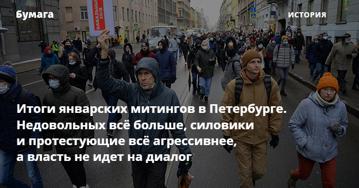 Читайте репортажи «Бумаги» с митингов 23 и 31 января, а также смотрите фотогалереи с акций. Мы рассказывали о десятках арестов и штрафов, уголовных делах и задержанных на митинге 31 января. Здесь вы найдете инфографику со сравнением числа задержаний на всех крупных протестных акциях с 2000 года в Петербурге. А тут — монологи протестующих.