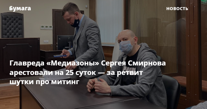 Тверской районный суд Москвы арестовал на 25 суток главного редактора «Медиазоны» Сергея Смирнова за ретвит шутки с указанием времени акции в поддержку политика Алексея Навального. Об этом сообщила «Медиазона».