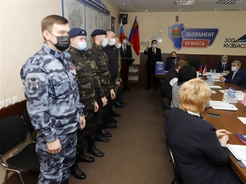 Парламент Кузбасса наградил благодарственными письмами сотрудников Росгвардии за «большой личный вклад» в обеспечение охраны общественного порядка. Об этом сообщили в ведомстве и заксобрании после протестных акций 23 и 31 января. На обнародованных фото награжденных скрыты их лица.