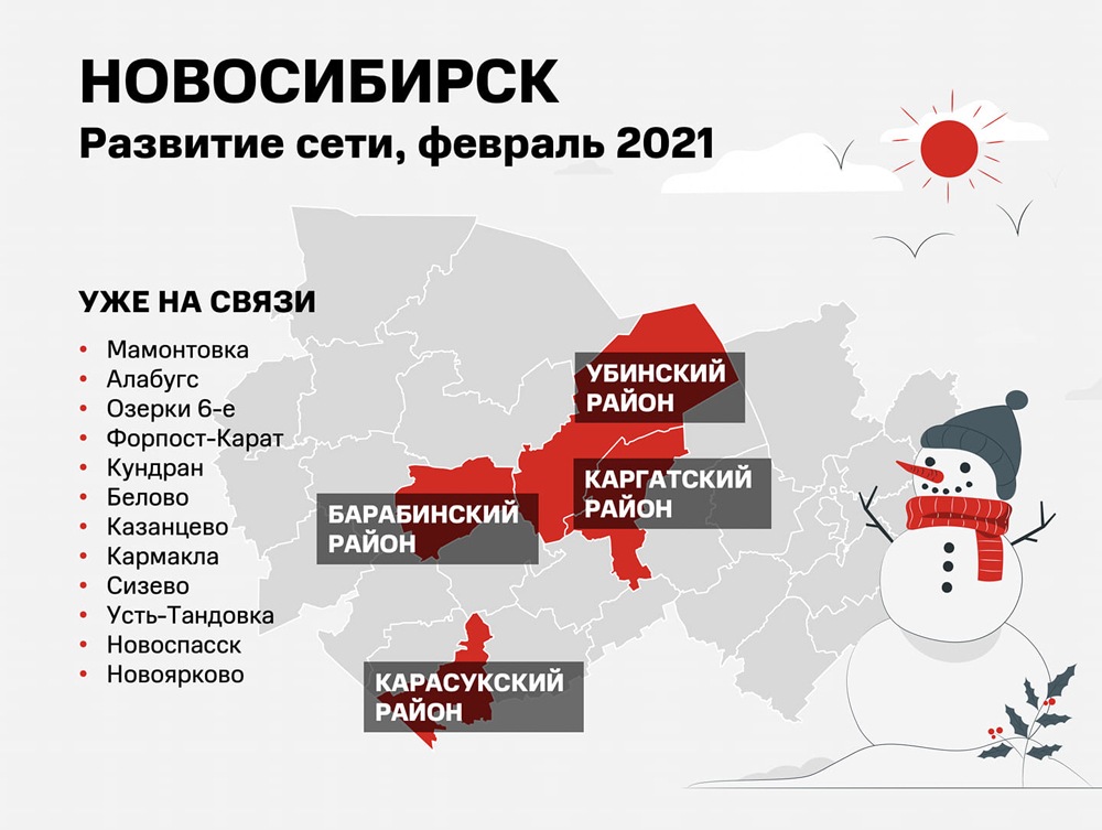 Голосовой связью и скоростным мобильным интернетом теперь, по данным компании, обеспечены жители каргатских сел и деревень Мамонтовое, Алабуга, Озерки 6-е и Форпост Каргат, где в общей сложности проживает всего около 1200 человек. Скоростной интернет LTE доступен жителям деревни Кундран в Убинском районе, а также деревень Белово, Казанцево, Кармакла, Сизево, Усть-Тандовка, сел Новоспасск и Новоярково в Барабинском районе. LTE теперь отлично «ловит» и в селе Михайловка, деревне Кукарка, поселках Рождественский, Астродым и Кучугур Карасукского района.