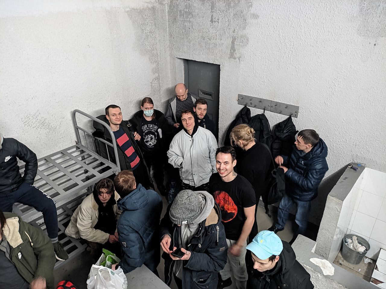 Главный редактор «Медиазоны» Сергей Смирнов (у двери камеры) и другие арестованные в Сахарово. Фото: телеграм-канал «Протестный МГУ»