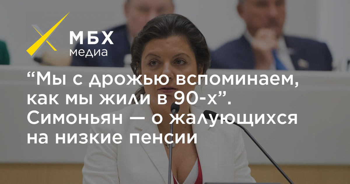 «Мы с дрожью вспоминаем, как мы жили в 90-х. Когда сейчас говорят — пенсии маленькие… Да, они маленькие. Но они на порядок больше, чем были. И будут расти, дайте только время нашей стране нормально развиваться без потрясений. Более того, их вообще не платили, про это вы забыли?», — заявила Симоньян.