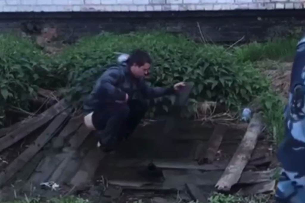 На опубликованных кадров отчетливо виден сотрудник в форме, который находится рядом с ныряющим в выгребную яму мужчиной.
