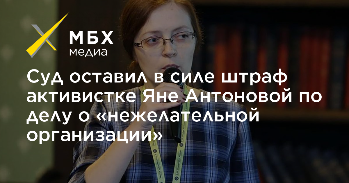 Ленинский районный суд Краснодара оставил в силе постановление мирового суда о штрафе в 15 тысяч рублей активистке Яне Антоновой за осуществление деятельности «нежелательной организации» (статья 20.33 КоАП). Об этом сообщил «МБХ медиа» координатор «Правозащиты Открытки» Алексей Прянишников.