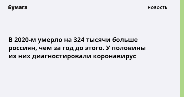 Всего за 2020 год умерло 2 миллиона 124,5 тысячи человек. Это на 324 тысячи больше, чем год назад. При этом около половины случаев избыточной смертности — умершие с диагностированным коронавирусом. Основной причиной смерти COVID-19 признали у 86 498 россиян, еще в 17 470 случаях коронавирус предполагается как основная причина. В 13 524 случаях коронавирус ускорил развитие других заболеваний. У 44 937 умерших COVID-19 не повлиял на летальный исход.