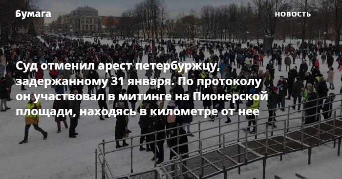 Красногвардейский районный суд отменил арест петербуржцу Давиду Сепашвили за участие в протестной акции 31 января. Об этом сообщает «Апология протеста».