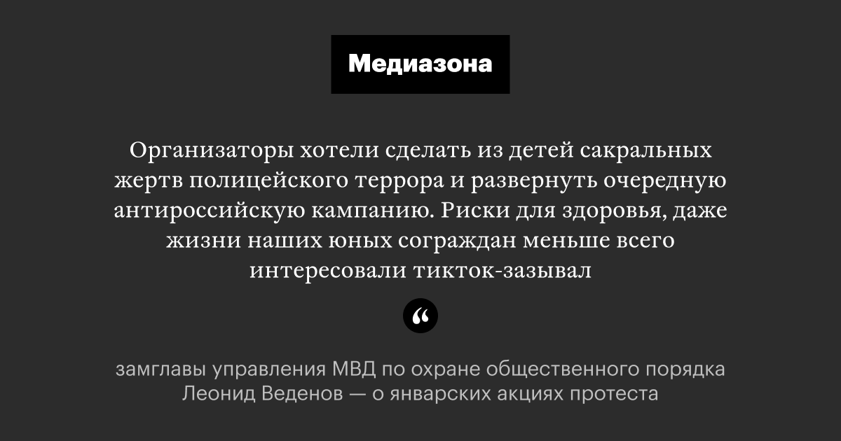 «Организаторы хотели сделать из детей сакральных жертв полицейского террора и развернуть очередную антироссийскую кампанию. Риски для здоровья, даже жизни наших юных сограждан меньше всего интересовали тикток-зазывал, для которых подростки на таких акциях такое же пушечное мясо, как и все остальные», — сказал Веденов на заседании комиссии Госдумы по расследованию фактов вмешательства иностранных государства во внутренние дела России.