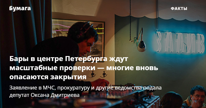 К началу февраля большинство рестораторов в курсе запроса Дмитриевой: в основном из соцсетей и СМИ. Опрошенные «Бумагой» владельцы баров говорят, что некоторых о проверках уведомил комитет по вопросам законности, правопорядка и безопасности.