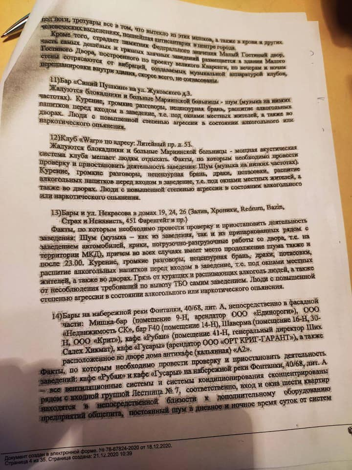 Документ касается более чем 40 адресов, на которые поступали жалобы от местных жителей, уточнила Дмитриева. Она отказалась огласить полный список заведений, но сказала, что они находятся в Адмиралтейском и Центральном районах (в том числе на улице Рубинштейна и Думской). «Думаю, если бы группы гражданских активистов были созданы в Василеостровском и Петроградском районах, жалобы были бы аналогичные», — говорит депутат.