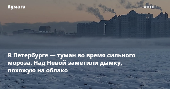 Утром 10 февраля в Петербурге заметили густой туман, который появился во время сильного — до минус 23 градусов — мороза. Над Невой образовалась дымка, похожая на облако. Очевидцы опубликовали фотографии в соцсетях.
