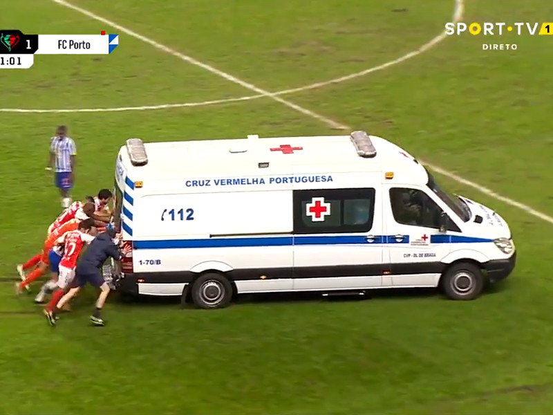 Футболисты "Браги" и "Порту" были вынуждены толкать машину скорой помощи, которая заглохла посреди поля во время матча полуфинала Кубка Португалии, передает агентство "Р-Спорт".