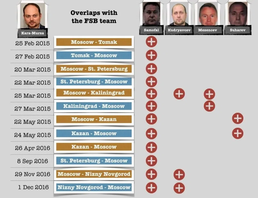 Журналисты-расследователи проанализировали данные о поездках сотрудников спецслужб, осуществлявших, по сведениям Bellingcat, слежку за Навальным на протяжении нескольких лет. Они пришли к выводу, что те же люди следовали за Владимиром Кара-Мурзой непосредственно перед тем, как он два раза попадал в реанимацию в результате отравления неизвестным веществом в 2015 и 2017 гг.