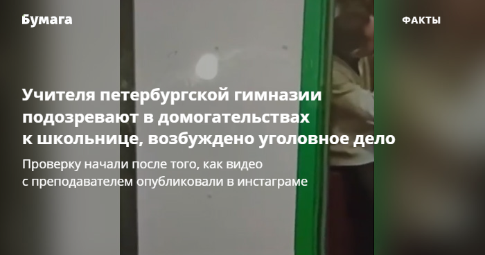 В ночь на 11 февраля в инстаграме появилось видео, на котором мужчина прижимает к себе и пытается поцеловать девушку-подростка. По данным блогеров и СМИ, это учитель одной из гимназий Приморского района Петербурга и ученица восьмого класса.